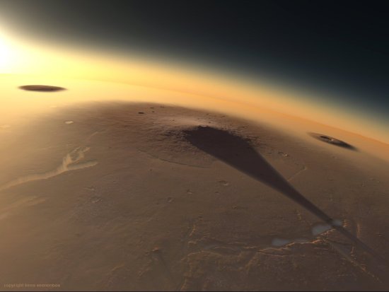 Montes Elysium ao pôr-do-sol e sob uma tempestade de poeira. À esquerda vê-se Hecates Tholus e à direita Albor Tholus. Créditos: Space4Case.