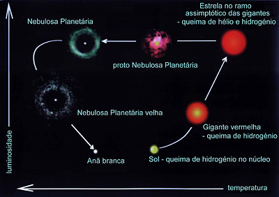 Figura 4: Esquema da vida de uma estrela do tipo solar (adaptação da Figura 7.2 de "Cosmic Butterflies - The Colorful Misteries of Planetary Nebulae" de S. Kwok).