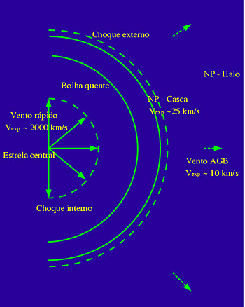 Em síntese, as estrelas do tipo solar, quando chegam às fases finais de suas vidas, expelem grande parte do gás da sua atmosfera, pelo menos em dois episódios distintos de perda de massa. Primeiro, devido ao vento lento de uma estrela no ramo assimptótico das gigantes (ou estrela AGB), cuja velocidade típica é da ordem de 10 km/s, com uma taxa de perda de massa de 10-5 Msol/ano. E depois, através do vento rápido, expelido durante a fase imediatamente posterior da estrela central (ou seja, no vento de uma pós-AGB), caracterizado por 10-7 Msol/ano e que alcança uma velocidade de até 2.000 km/s. Aqui vale ressaltar que a mais importante das características destes ventos é que eles ocorrem durante o último milhão de anos, de estrelas que vivem, tipicamente, 10.000 milhões de anos.