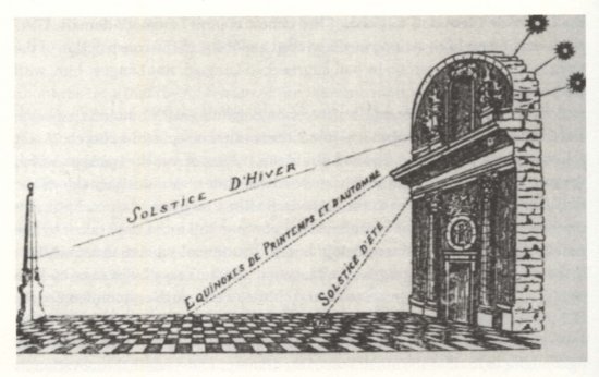Projecção dos raios solares, na igreja parisiense de St. Sulpice, nos solstícios de Inverno (linha à esquerda), de Verão (linha à direita) e nos equinócios da Primavera e do Outono (linha central). Gravura da obra Saint-Sulpice, de Lemesle (1931).
