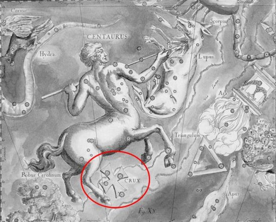 As Constelações do Sul por Johannes Hevelius (1611-1687) com a posição do Cruzeiro em relação ao Centauro.
