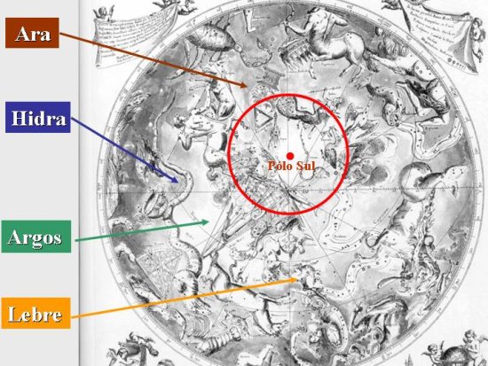 | Conceito digno foi do ramo claro Do venturoso Rei que arou primeiro O mar, por ir deitar do ninho caro O morador de Abyla derradeiro. Este, por sua indústria e engenho raro, Num madeiro ajuntando outro madeiro, Descobrir pôde a parte que faz clara De Argos, da Hidra a luz, da Lebre e de Ara. Canto VIII, 71 | As constelações Argos, Hidra, Lebre e Ara são todas constelações do sul, mas todas elas são visíveis (pelo menos parcialmente) no hemisfério norte. |