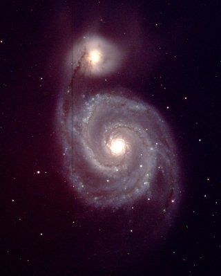 M51, a galáxia Whirlpool. Imagem obtida dia 30 de Junho de 2005, dois após ter sidodescoberta uma supernova nesta galáxia. A supernova é a estrela brilhante imediatamente abaixo do núcleo da galáxia maior, dentro do 1º braço espiral. Imagem obtida com o telescópio de 0,9m do NOAO Kitt Peak National Observatory, E.U.A., por equipas de professores. Crédito: HOU TRA Glenn Reagan.