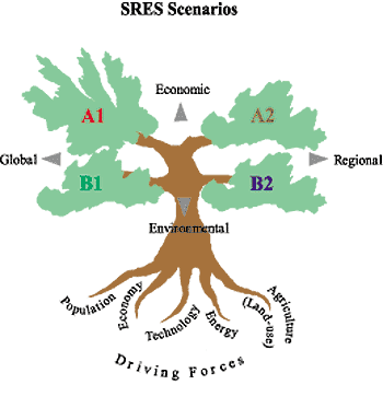 Figura 2 – Representação esquemática das quatro “famílias” de cenários SRES, respectivas variáveis e eixos de tendências (global vs. regional e económico vs. Ambiental).