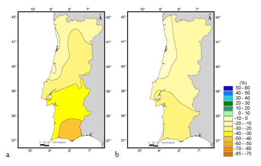 Em relação aos cenários de precipitação os cenários apontam para que, em termos anuais, ocorra uma diminuição da precipitação no final do século XXI, mais significativa no cenário A2, que poderá ser superior a 30 % no Sul do país (e.g. a região do Algarve pode perder até 40 % da precipitação anual) e que deverá variar entre os 10 % e os 30 % no Norte e Centro. Já no cenário B2 esta diminuição é mais uniforme, com as perdas em termos de precipitação a variarem entre os 10 % e os 30 %, sendo que as maiores perdas se projectam também para o Sul do país.