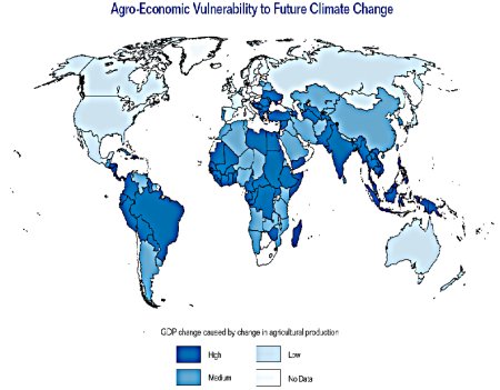 Figura 1 – Vulnerabilidade global às alterações climáticas em termos agro-económicos (i.e. variações no PIB como consequência de alterações na produção agrícola). Créditos: [7].