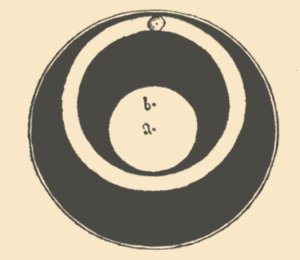 O círculo interior a branco contém as esferas dos planetas inferiores ao Sol: Lua, Mercúrio e Vénus. Fora do círculo negro, ficam as esferas dos planetas superiores.