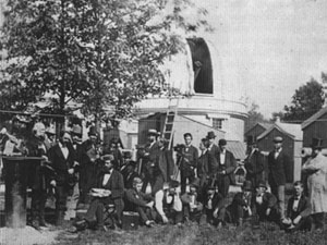 Os participantes nas expedições americanas reuniram-se no Observatório Naval dos Estados Unidos na Primavera de 1874 para ensaiarem todos os procedimentos. Sentado, à esquerda, está Simon Newcomb. De pé, com um chapéu claro, junto à escada, encontra-se Asaph Hall, que descobriria os dois satélites de Marte com o telescópio que se vê ao fundo. Crédito: Observatório Naval dos Estados Unidos