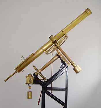 Telescópio Troughton, equipado com uma objectiva de 11,5 cm (4,5 polegadas) de diâmetro, utilizado nas observações do trânsito de Vénus de 6 de Dezembro de 1882. Estava instalado no Observatório Astronómico da Universidade de Coimbra — onde hoje se mantém, no núcleo museológico. Cortesia do Prof. Artur S. Alves
