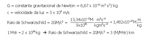 ou seja, aproximadamente a três vezes a massa da estrela em unidades de massas solares e o resultado é dado em km. Um buraco negro estelar típico tem uma massa de aproximadamente 10 MSol e um horizonte de eventos de apenas 30 km.