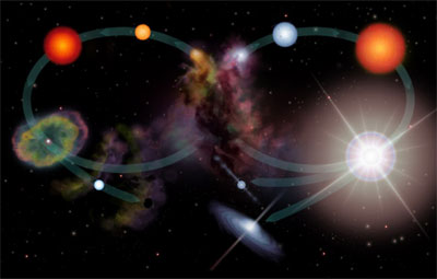 Crédito: NASA. A figura compara os diferentes ciclos evolutivos das estrelas. Na parte central uma nebulosa dá origem a estrelas com diferentes massas. Na parte esquerda da figura está representado o ciclo evolutivo de uma estrela de pequena massa (como o Sol), que terminará a sua vida como uma anã branca. Na parte direita está representado o ciclo de vida de uma estrela de grande massa que pode terminar a sua vida como uma estrela de neutrões ou um buraco negro.