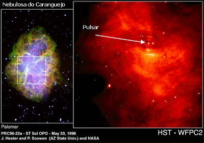 Crédito: HST (NASA/ESA). A imagem da esquerda mostra a Nebulosa do Caranguejo. Trata-se do remanescente de supernova, a uma distância de 6000 anos-luz, que foi descoberto pela primeira vez em 1731 pelo astrónomo amador inglês John Bevis. Contudo, a explosão da supernova que originou a nebulosa foi avistada pelos chineses, a 4 de Julho de 1054, tendo o seu brilho sido 4 vezes superior ao de Vénus! A imagem da direita mostra a região interior da nebulosa onde se encontra um pulsar (uma estrela de neutrões que emite pulsos regulares). O pulsar está visível na parte central da imagem. A período de rotação de um pulsar é extremamente pequeno, O pulsar da nebulosa do caranguejo por exemplo roda sobre o seu próprio eixo 33 vezes por segundo.