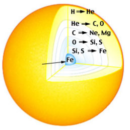Crédito: NASA. Em estrelas de massa elevada o ciclo evolutivo só termina quando o núcleo da estrela é constituído essencialmente por ferro, um elemento estável que não pode ser transformado. A estrela parece uma cebola em que cada camada é constituída pelos diferentes elementos produzidos durante o ciclo evolutivo da estrela.