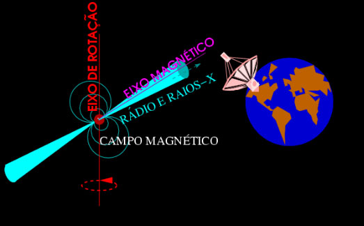 Crédito: NUCLIO (Cristina Zurita). Esquema que mostra o mecanismo de emissão dum pulsar. Em algumas estrelas de neutrões os intensos campos magnéticos e a rápida rotação fazem com que sejam emitidas partículas carregadas (electrões e protões fundamentalmente) que emitem radiação electromagnética: ondas de rádio, raios-X, raios gama, radiação na banda do óptico e ultravioleta. A radiação é emitida na direcção do eixo magnético na forma de um feixe bilateral. Em geral o eixo magnético não coincide com o eixo de rotação do pulsar e visto a partir da Terra, os feixes são detectados como pulsos, um comportamento semelhante ao de um farol.