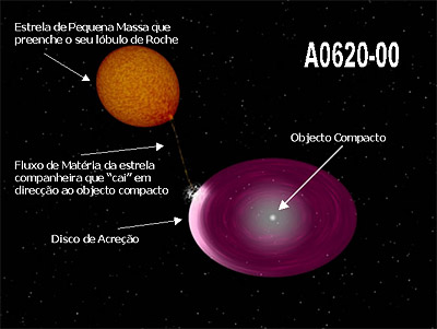 Crédito: Robert Hynes. Binário de raios-X de pequena massa A0620-00. Descoberto em 1975 tornou-se rapidamente um promissor candidato a buraco negro estelar, protótipo para o estudo de outros candidatos. Contudo a determinação definitiva da sua massa ainda não foi possível e os limites encontrados esbarram perigosamente no limite estabelecido para a massa de uma estrela de neutrões 3 Msol.