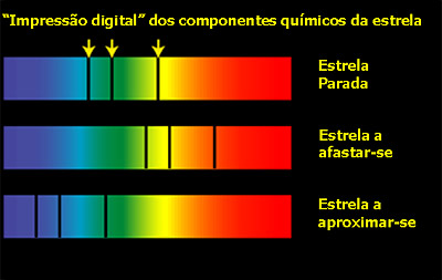 Crédito: NASA. A análise do espectro de uma estrela permite determinar a sua composição a partir do estudo das linhas espectrais. Quando a estrela está em movimento as linhas espectrais aparecem desviadas da sua posição num referencial em repouso. Se o objecto estiver a afastar-se, as linhas sofrem um desvio em direcção ao vermelho. No sentido contrário, ou seja, ao aproximar-se, o desvio é em direcção a parte azul do espectro electromagnético.
