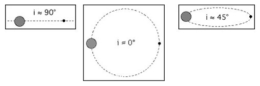 Crédito: Steven Degennaro. A figura da esquerda representa um sistema binário com uma inclinação de 90º. Neste caso, e tendo a estrela companheira a forma de uma pêra, a curva de luminosidade resultante é uma curva elipsoidal perfeita. No caso central não é possível observar qualquer variabilidade pois a estrela apresenta ao observador sempre a mesma superfície. Todos os outros casos são mais difíceis de avaliar como por exemplo os sistemas que apresentam uma inclinação de 45º.