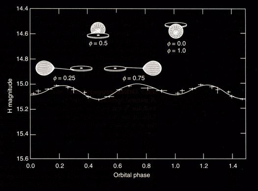 Felizmente há uma forma de conhecer o ângulo de inclinação. Como vimos no tópico anterior, a estrela de pequena massa preenche o seu lóbulo de Roche e assume a forma de uma pêra. Isso fará com que a estrela apresente ao observador faces distintas durante o seu movimento orbital. Ou seja, a luz proveniente da estrela aparece então modulada, com dois máximos no brilho quando se apresenta ao observador “de lado”, ou seja a maior superfície, e dois mínimos quando apresenta a parte frontal e posterior de menor superfície. Como este é um efeito que depende só da geometria do sistema binário, a amplitude da modulação, chamada modulação elipsoidal, depende fortemente do ângulo de inclinação.