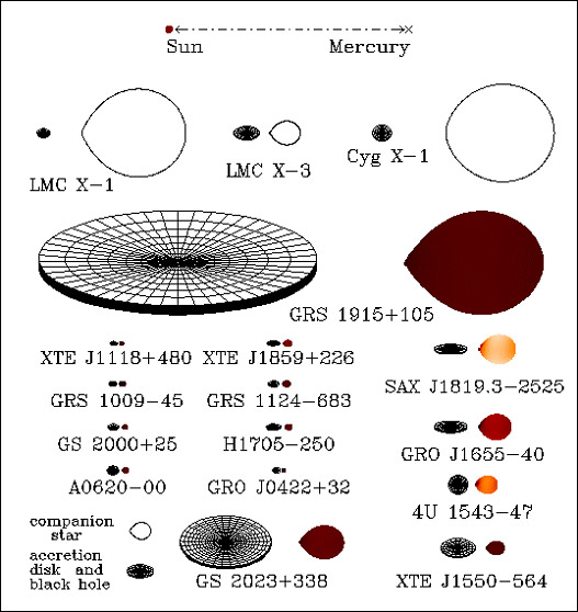 Crédito: Jerome Orosz. Este quadro apresenta 17 fortes candidatos a buracos negros estelares. Catorze são binários de pequena massa e 3 de grande massa.