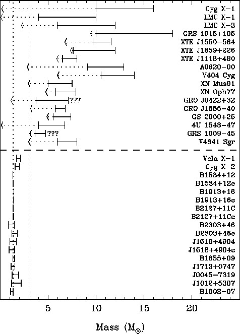 Crédito: J.Orosz. Na parte superior da figura estão alguns dos mais importantes candidatos a buracos negros e a indicação das suas massas. Na parte inferior são sistemas onde o objecto compacto é uma estrela de neutrões. Facilmente se verifica que neste último caso as massas encontram-se todas num intervalo inferior a 1,5 Msol.
