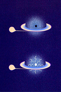 Crédito: Harvard Smithsonian Center for Astrophysics. Visão de artista de dois sistemas binários onde uma das componentes é um objecto compacto. No esquema superior o objecto compacto é um buraco negro e no inferior uma estrela de neutrões. A distinção entre estes dois sistemas pode ser feita através da observação da sua emissão em raios-X. Por não possuir um horizonte de eventos a estrela de neutrões emitirá mais radiação do que o sistema contendo um buraco negro.