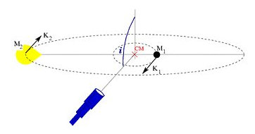 Crédito: NUCLIO (C.Zurita). Esquema dum sistema binário. O objecto compacto (de massa M1) e a estrela companheira (de massa M2) estão a orbitar em torno ao centro de massa (CM) do sistema com velocidades radiais K1 e K2 respectivamente. Como o objecto compacto é invisível temos que extrair toda a informação que precisamos da observação da estrela. A órbita forma um ângulo de inclinação i com a linha de observação.