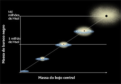 Crédito: NASA. Esta imagem mostra a correlação entre a massa do buraco negro e a massa do bojo central de uma galáxia. Estudos realizados na última década sugerem que todas as galáxias deverão ter um buraco negro central com massas que podem atingir milhares de milhões de vezes a massa do nosso Sol.