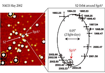 Crédito: ESO. O desenho mostra a trajectória de uma estrela em torno do que deverá ser um buraco negro na região central da nossa galáxia .