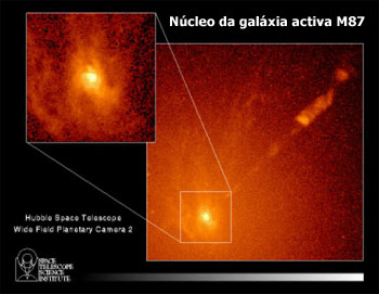Crédito: NASA / HST. A galáxia conhecida como M87 alberga um dos primeiros buracos negros descobertos no centro de uma galáxia, que deverá ter uma massa de milhares de milhões de vezes a massa do Sol. Na imagem podemos ver um zoom da região central onde deverá estar escondido este gigantesco buraco negro e a emissão de um jacto que tem uma extensão de pelo menos 5.000 anos-luz.