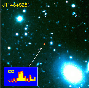 Crédito: Keck, S.G. Djorgovski, A. Mahabal, e M. Bogosavljevic, Caltech. O quasar J1148+525, assinalado com uma seta, é o mais longínquo encontrado até hoje no Universo observável. As suas linhas espectrais apresentam um desvio para o vermelho da ordem de 6,4 o que significa que encontra-se a uma distância de cerca de 13 mil milhões de anos-luz. No quadro pequeno mostra-se o espectro do quasar a partir do qual foi possível determinar a sua distância.