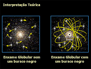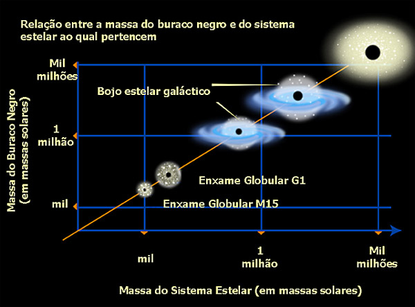 Crédito: NASA. Relação entre a massa do buraco negro e a massa do enxame de estrelas. Os enxames globulares contêm as estrelas mais antigas do Universo. Se ficar comprovado que possuem buracos negros na sua região central, então muito provavelmente já o teriam quando se formaram. Este seria um importante passo para a compreensão da sua formação.