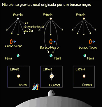 Crédito: NASA. Um buraco negro ao passar entre o observador e um objecto distante vai dar origem a um efeito a que damos o nome de lente gravitacional. O buraco negro age como uma lente provocando um aumento na luminosidade do objecto, neste caso uma estrela.