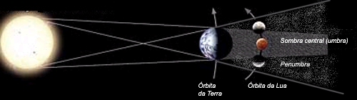 Fig. 5: Condições e aspecto de um eclipse lunar. Os raios solares penetrando a atmosfera da Terra junto do bordo serão espalhados e misturam-se com a sombra central, causando a coloração da Lua durante a fase da totalidade.