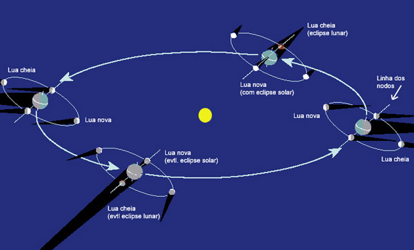 Fig.7: A Terra em órbita do Sol e a Lua em órbita em torno da Terra. Para que os eclipses no topo da imagem se possam repetir, será necessário atingir a mesma configuração dos astros. Por sinal, isto acontece aproximadamente cada 18 anos.