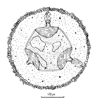 Estrutura desenhada de uma observação microscópica de uma lâmina do meteorito de Orgueil, apresentada como uma possível alga.