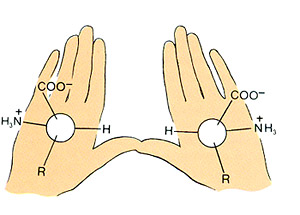 Forma esquerda e direita de aminoácidos encontradas em no meteorito de Murchison e noutros condritos, eliminando o perigo de contaminação terrestre.