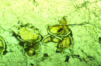 Glóbulos esféricos de carbonato no meteorito ALH 84001. O diâmetro destas estruturas é pouco inferior a um milímetro. (Crédito: JSC/NASA)