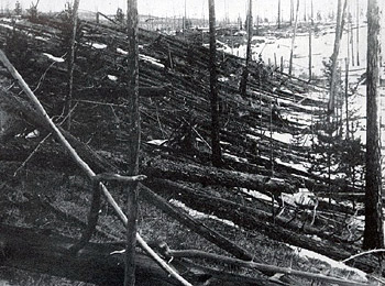 Árvores derrubadas na região de Tunguska, quando a região foi visitada pelo mineralogista Kulik em 1927. O derrube das árvores é radial em relação ao centro da explosão celeste de 30 de Junho de 1908. (Crédito: Comissão de Meteoritos da Academia de Ciências da Rússia)