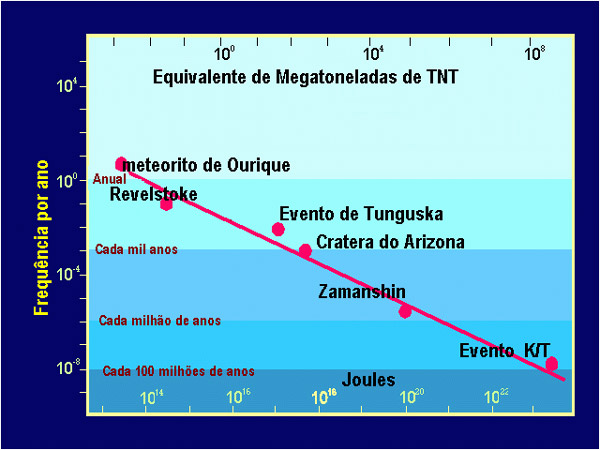 Frequência de impactos sobre a Terra e energia libertada, desde o meteorito de Ourique, com um peso de apenas 30 kg e que acontece no globo mais de uma vez por ano até ao evento catástrófico de há 65 milhões de anos (fronteira geológica do Cretácico com o Terciário – K/T).