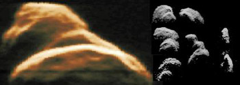 Fotos do asteróide rasante, com forma de amendoim, Toutatis que várias vezes motivou alarme junto dos media mas cuja órbita está perfeitamente conhecida, não oferecendo risco de colisão. (Crédito: JPL/NASA)