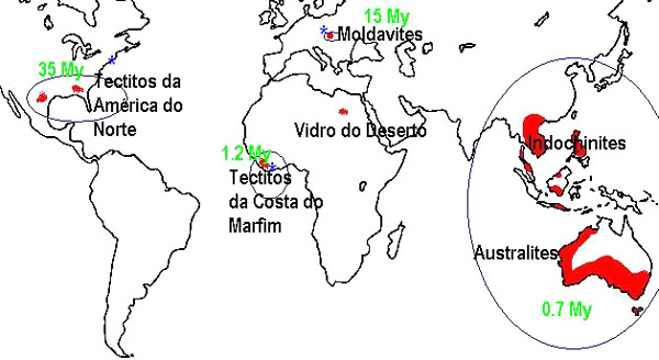 Mapa da correntes de tectitos conhecidas, sua idade e associação com as crateras que lhe deram origem, respectivamente: Chesapeake Bay para os tectitos da América do Norte (35 My); Ries para as moldavites (15 My) e Bosumtwi para os tectitos da Costa do Marfim. Para os tectitos da Australásia não é conhecida a sua cratera geradora, sendo a sua idade de apenas 700 mil anos.