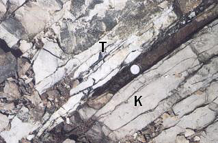 Fina camada de argila enriquecida em irídio que marca a passagem das rochas do Cretácico para as do Terciário e que é acompanhada por uma extinção em massa de fauna e flora há 65 milhões de anos. (Foto do autor)