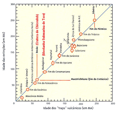 Correlação entre as idades dos grandes “traps” e as principais extinções em massa das espécies nos últimos 250 milhões de anos. Simultaneamente à erupção dos “traps” dão-se mega-impactos: provados no caso de Chicxulub há 65 milhões de anos, Manicouagan e Rochechouart há 210 milhões de anos, Popigai e Chesapeake Bay há 35 milhões de anos; e prováveis no caso de Tore, 300 km a Oeste de Peniche, uma estrutura com 91 milhões de anos. (Adaptado de Courtillot, 1995, Ribeiro, 1998 e Monteiro, 2004)
