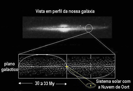 Curiosamente, o nosso sistema solar possui dois movimentos na galáxia – a Via Láctea – respectivamente: gasta 250 milhões de anos a dar uma volta em torno do eixo galáctico e um movimento oscilatório de saltitação acima e abaixo do plano de simetria imaginário que passa pelo centro da galáxia. Este autêntico movimento pendular do Sol, faz com que o sistema solar passe de 30 em 30 milhões de anos pelo plano médio da galáxia. É possível que ao passar pelo plano médio da galáxia o efeito gravítico da massa aí existente faça com que os cometas da Nuvem de Oort sofram um empurrão e muitos migrem para o sistema solar interior ocorrendo um período de maior número de impactos sobre as superfícies planetárias e consequentemente na Terra. Para alguns estudiosos a periodicidade das extinções maciças é coincidente com o período de 30 milhões de anos de passagem do sistema solar pelo plano médio da galáxia, facto que poderia explicar ainda muitas das periodicidades observadas em diferentes fenómenos terrestres.