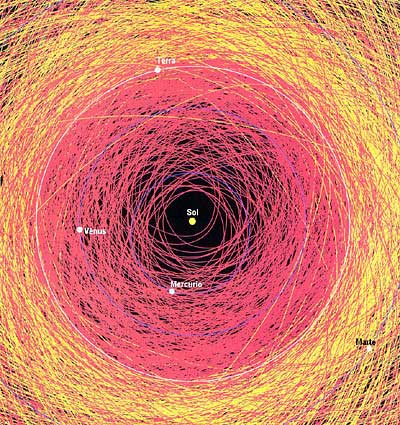 População de Near Earth Objects (NEOs) recenseada até 2000 e sobreposta às órbitas planetárias. (Adaptado de Steel, 2000)